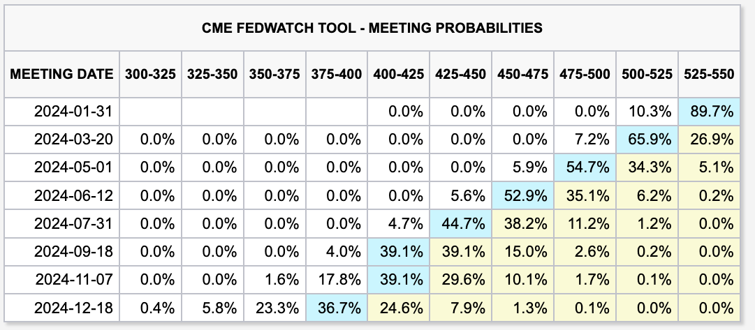 - 24년 1월 FOMC 금리 전망은 현행 유지가 89.7% 그리고 하락에 10.3% 로 전망되어 향후 금리가 유지 혹은 하락을 전망하고 있습니다.