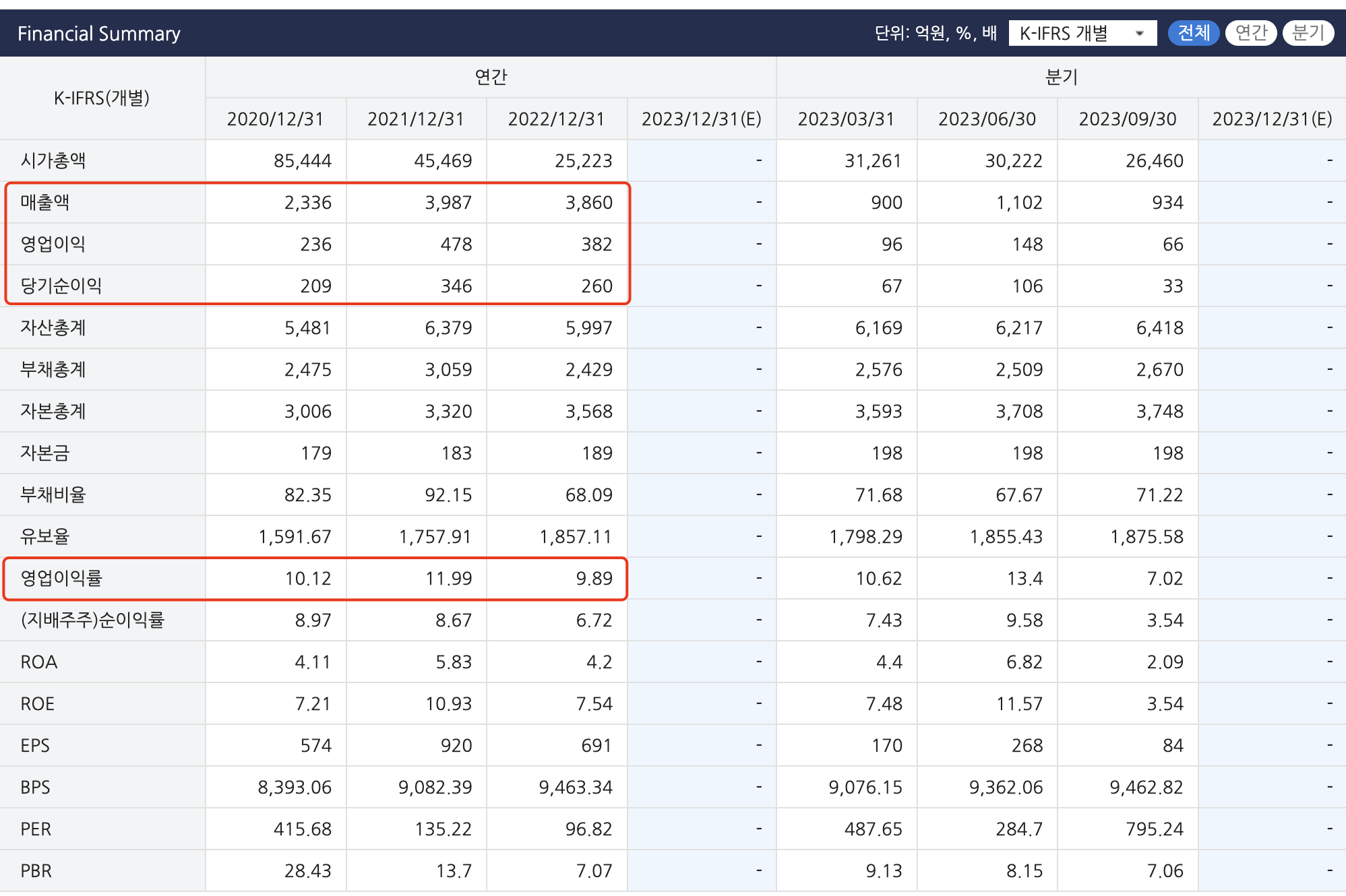 21년도에 비해 PER이 대폭 낮아진 것을 확인할 수 있습니다.