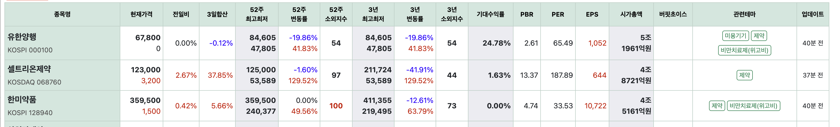 이는 다른 제약주에 비해 주가가 높게 평가된다는 의미이며 미래 가치의 반영이라고 볼 수 있겠습니다.