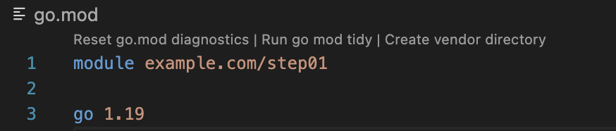 go mod init example.com/step01 # (1)