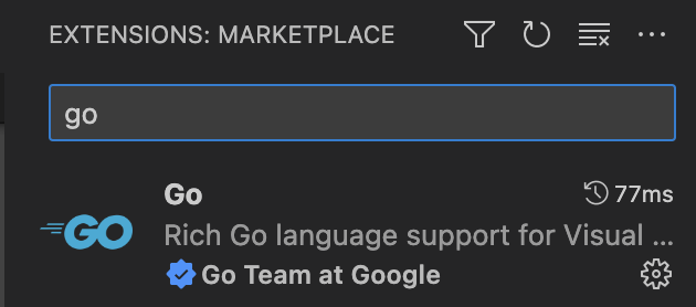 다시, vscode 로 돌아가봅시다. 그리고 마켓플레이스에서 갓 구글(Google)이 미리 만들어 둔 Go 를 설치합니다. 이 확장(extension)은 Go 프로그래밍을 vscode 에서 할수 있도록 도와줍니다.