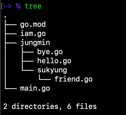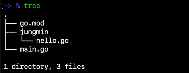 "go run ." 명령을 입력하니 잘 동작합니다. jungmin 폴더 내에 sukyung 이라는 새로운 폴더를 넣고 패키지 이름이 다른데도 불구하고 동작하는 것을 알 수 있습니다.