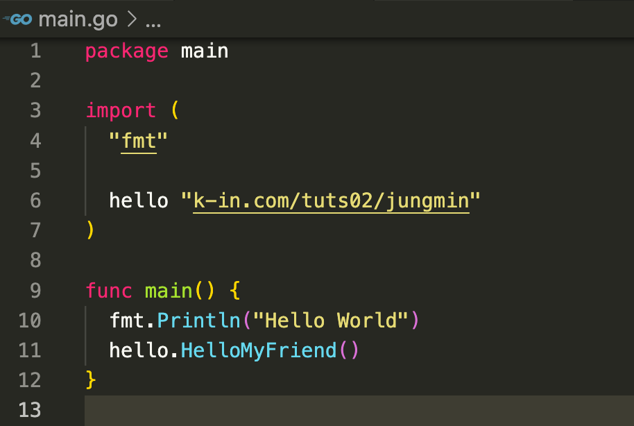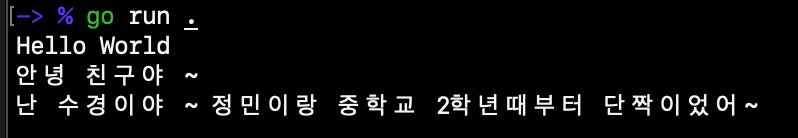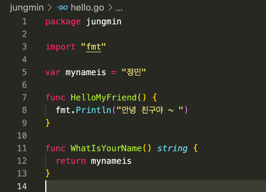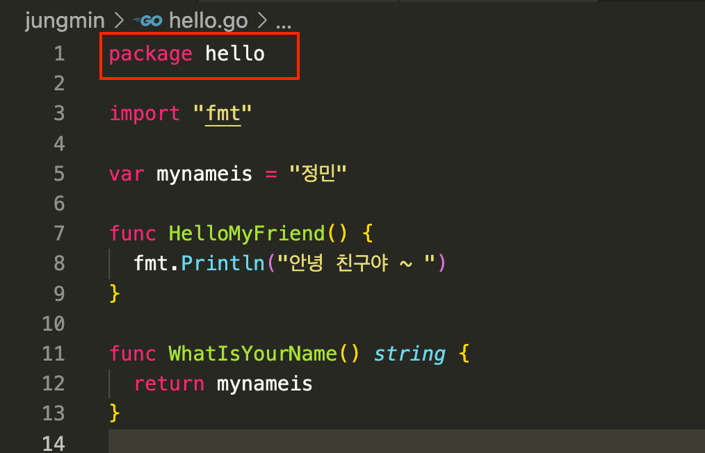 정민 친구는 hello.go 파일에 아래와 같이 작성했네요. 정겨운 친구의 대화입니다.