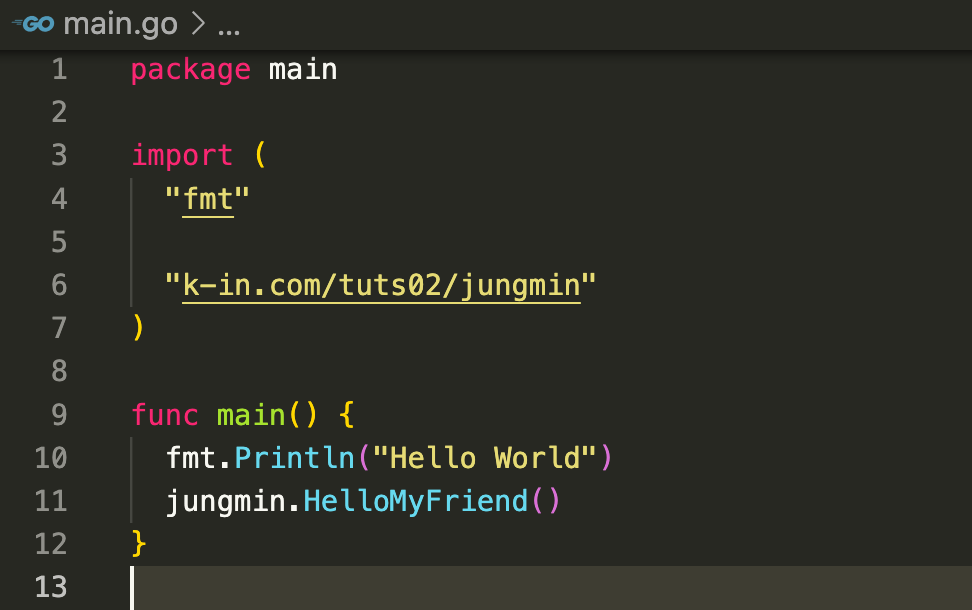 이제, main.go 파일을 조금 고쳐서 정민이와 수경이 모두에게 인사를 해봅시다.