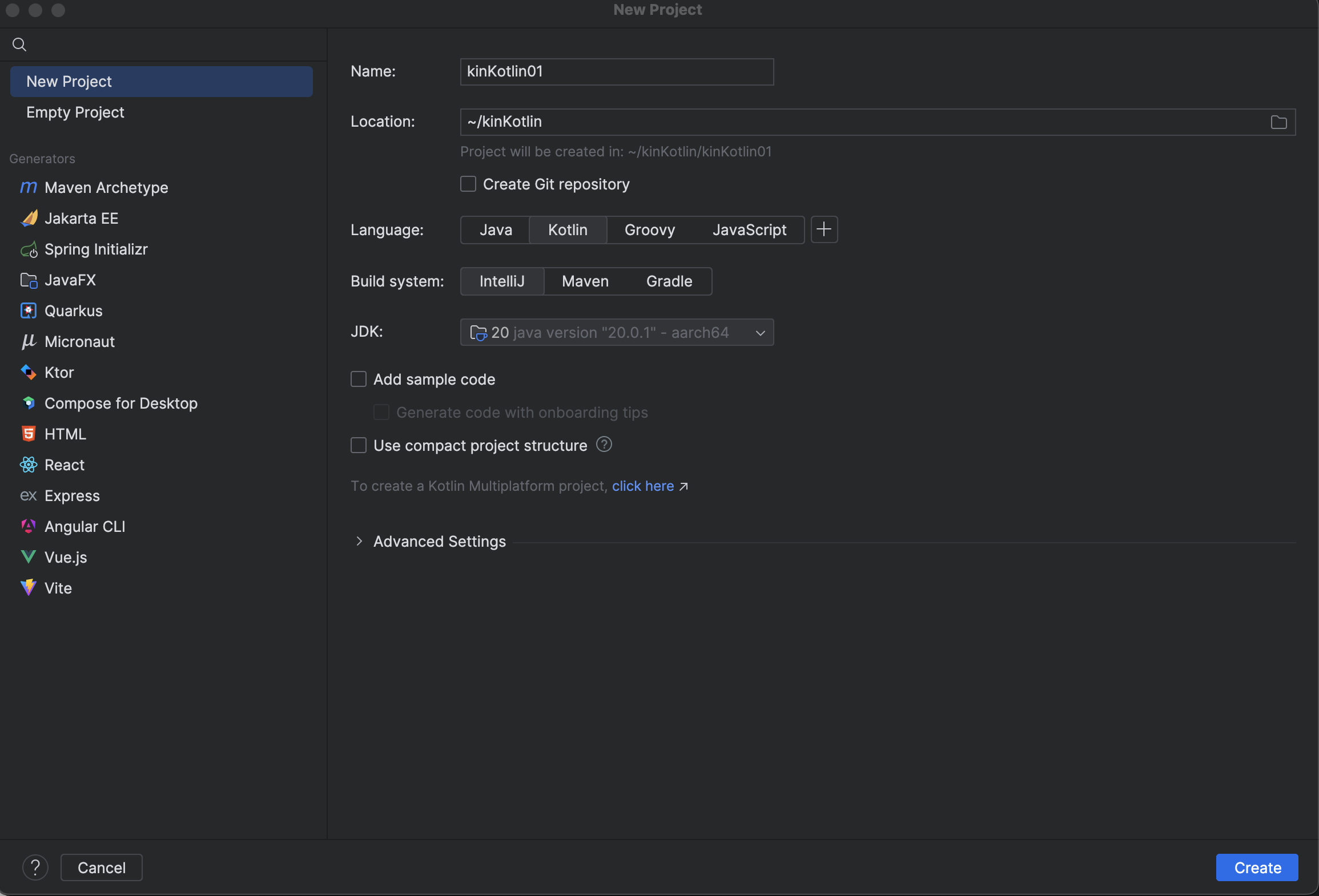 Kotlin 을 선택하고 JDK 버전은 20으로 지정합니다.