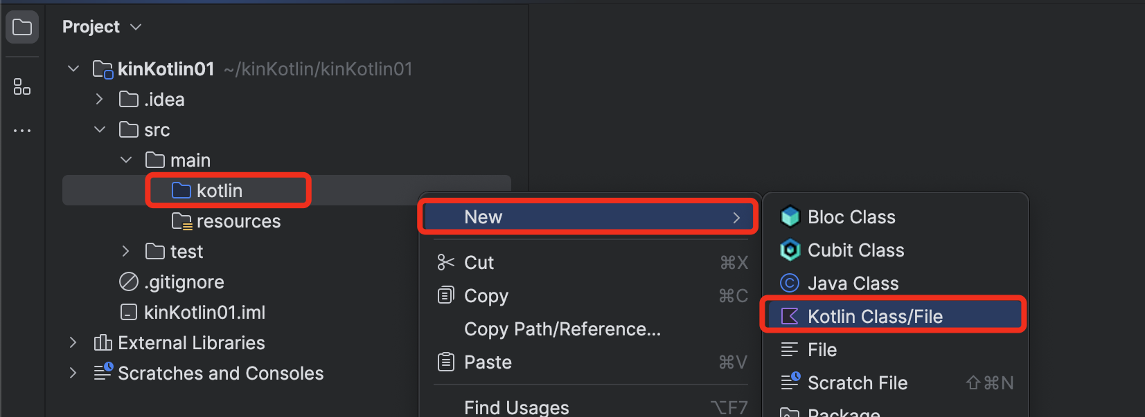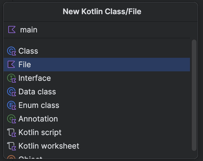 프로젝트가 생성되면 src 폴더 > main 폴더 > kotlin 폴더로 이동하여 우클릭한뒤 "New" > "Kotlin Class/File"을 선택합니다.