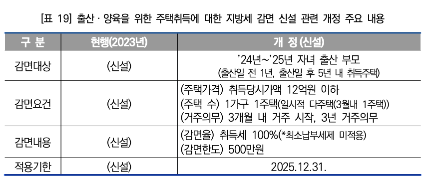 - 취득세 감면 대상: "2024년 1월 1일부터 2025년 12월 31일까지 자녀를 출산한 부모(미혼모, 미혼부 포함)"