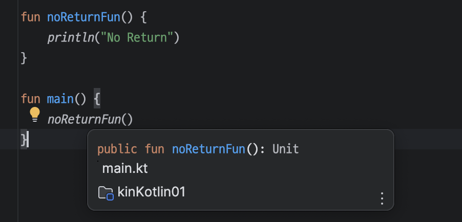 다만, 코틀린은 반환하는 타입을 지정하지 않을 경우 자동으로 Unit 타입으로 추론합니다.