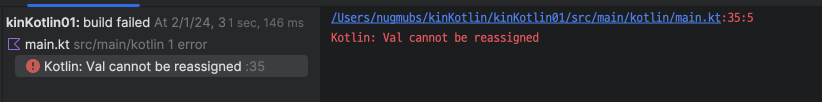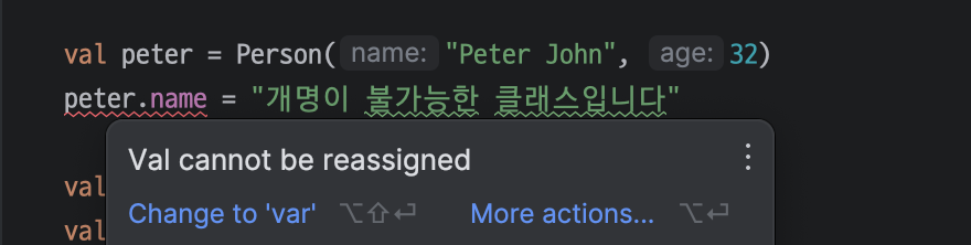 따라서, 아래와 같이 name 변수를 수정하려고 하면 "Kotlin: Val cannot be reassigned" 에러가 발생합니다.