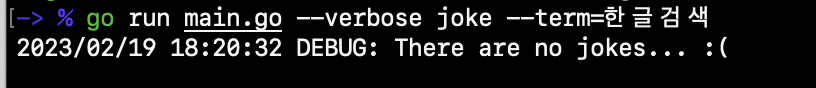 --verbose 옵션은 main.go 뒤에 혹은 joke 뒤에 놓여도 동일하게 동작합니다.
