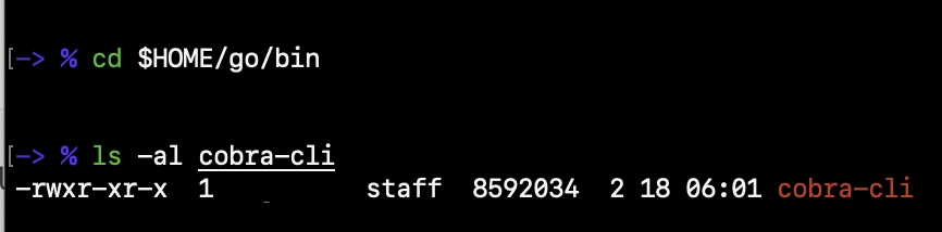 그리고 go install 명령을 cobra-cli 유틸리티를 $HOME/go/bin 폴더에 설치합니다.