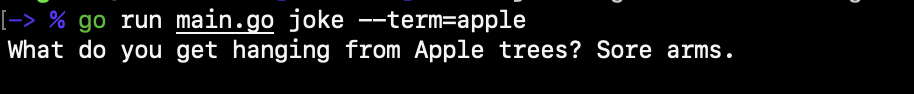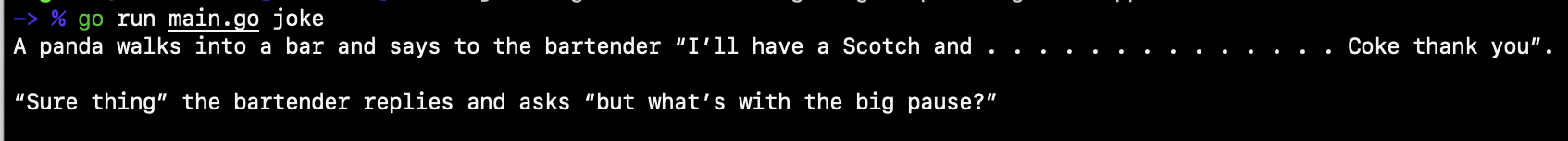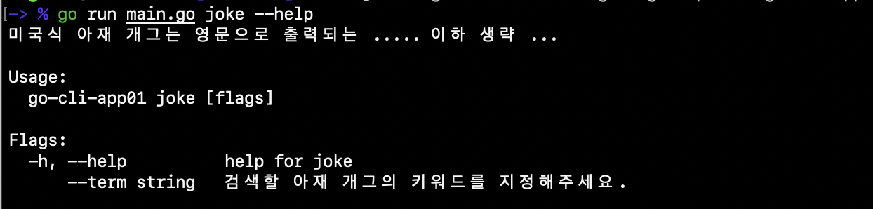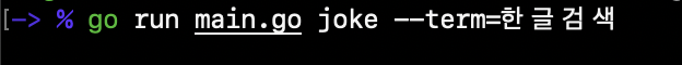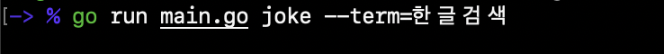 go run main.go joke 와 같이 명령어를 사용하면 곧바로 프로그램은 아재 개그를 출력합니다.
