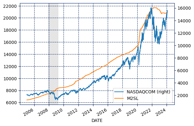 df = fdr.DataReader('FRED:NASDAQCOM,M2SL', start='2005', end='2024-10-30')