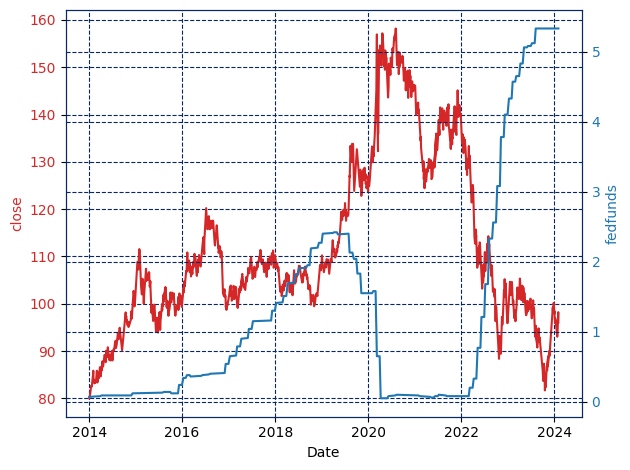 ax2.set_ylabel('fedfunds', color=color)