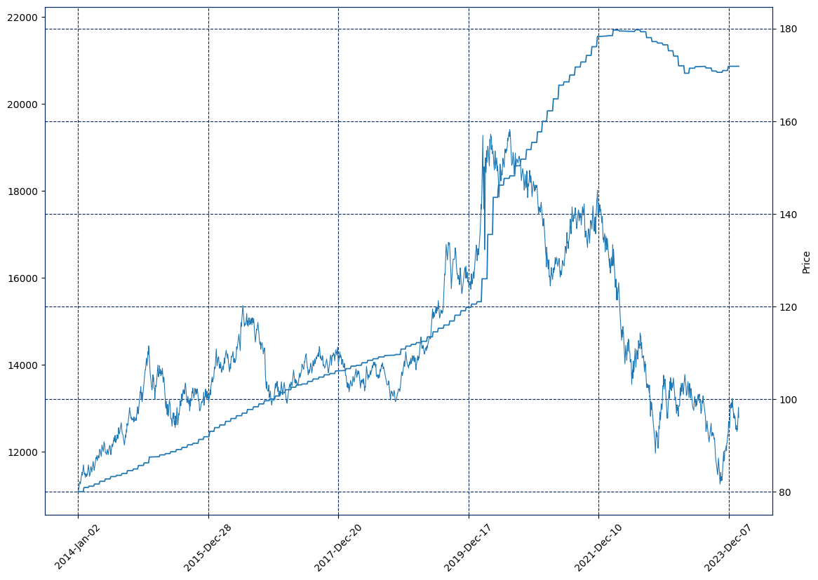또 하나의 팁은 두 데이터의 스케일이 다르다는 점입니다. 주가지수는 80~160사이의 값을 가지는 반면 기준금리의 경우 0~6 사이의 값을 가집니다. 이를 표준화해서 추세만 확인하거나 Secondary Y 축을 사용하면됩니다. 금융분야에서는 스케일을 보존하기 위해 Secondary Y축을 주로 사용합니다.