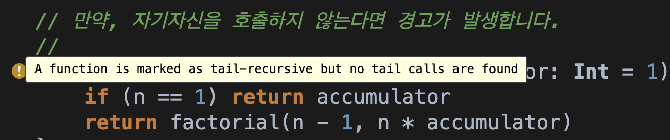 꼬리 재귀 함수를 사용하기 위해서는 `tailrec`이라는 키워드를 사용해서 명시적으로 함수를 정의해야합니다.